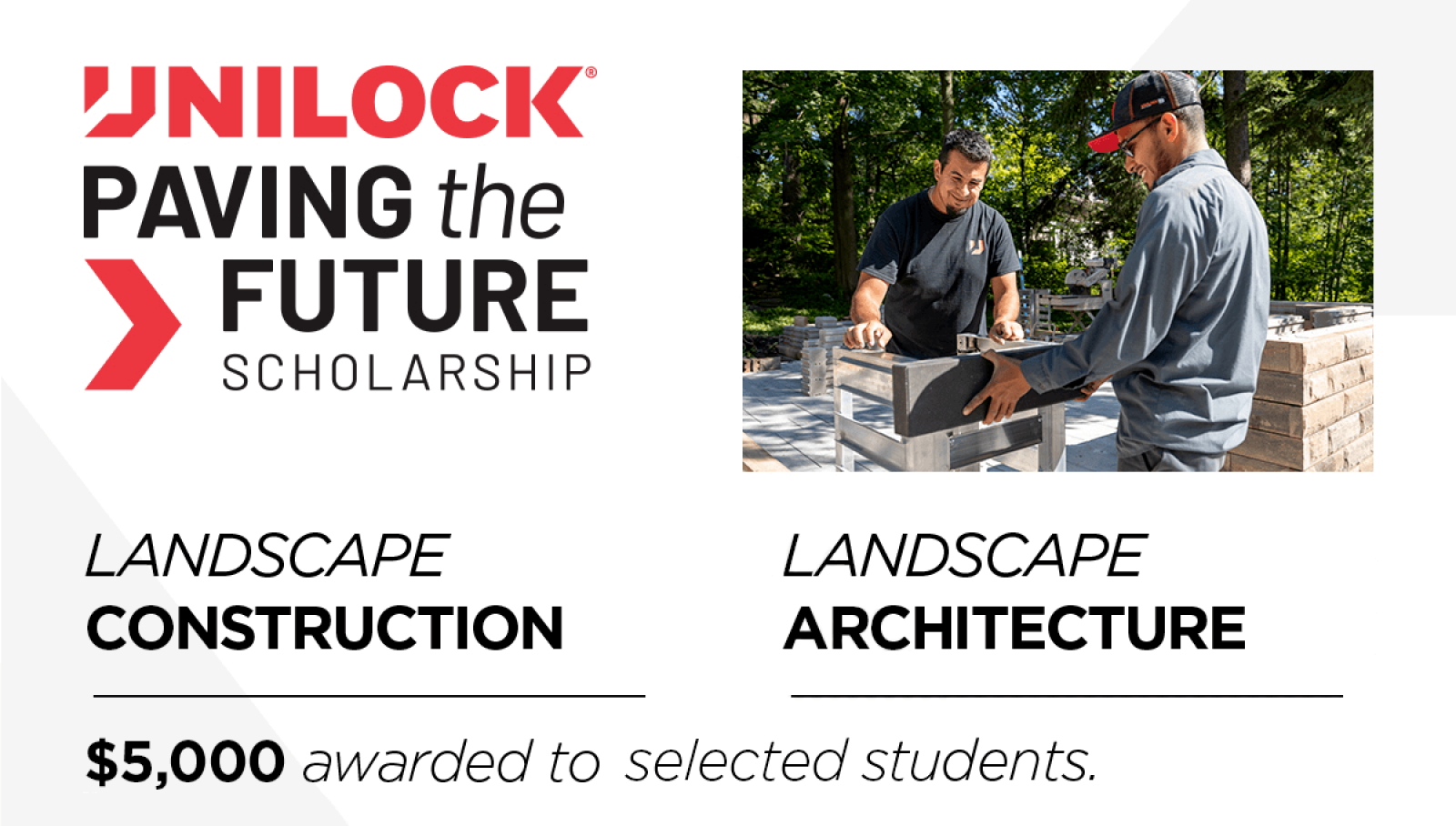 The scholarship is open to students enrolled in their final year of a landscape architecture or landscape construction post-secondary program in the U.S and Canada. Unilock will award $5,000 to each scholarship recipient, helping to seed the new generation of landscape design, landscape architecture and construction leaders by supporting educational expenses including tuition fees, but also as a partner to call on for support and resources as they start their career.