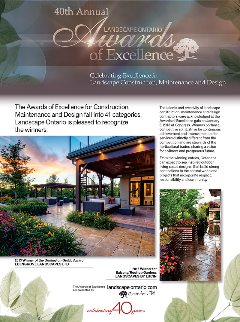 The talents and creativity of landscape construction, maintenance and design contractors were celebrated at the Awards of Excellence gala on January 8, 2013 at Congress. Winners of the awards portray a competitive spirit, strive for continuous achievement and improvement, offer services distinctly different from the competition and are stewards of the horticultural trades, sharing a vision for a vibrant and prosperous future.