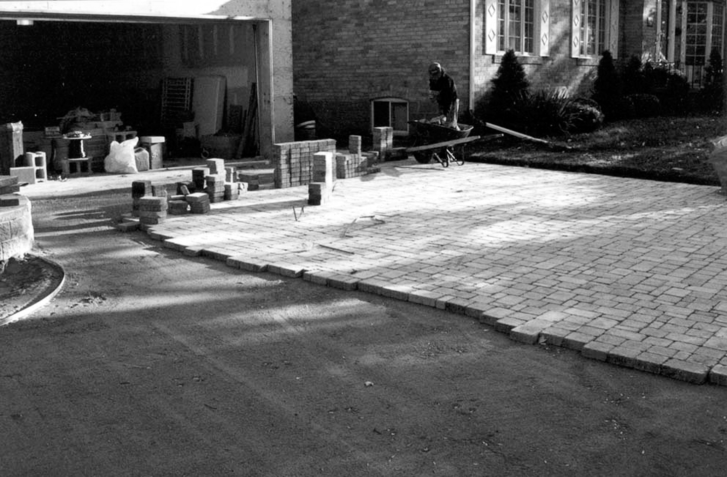 Curbstones were installed along the perimeter property lines and where the driveway abutted with the neighbour’s gardens and lawn. The contractor was also careful to slope the driveway away from the house towards the street. The slope required to allow rapid drainage was about a 20 mm fall every 1 m, or about a two per cent slope.