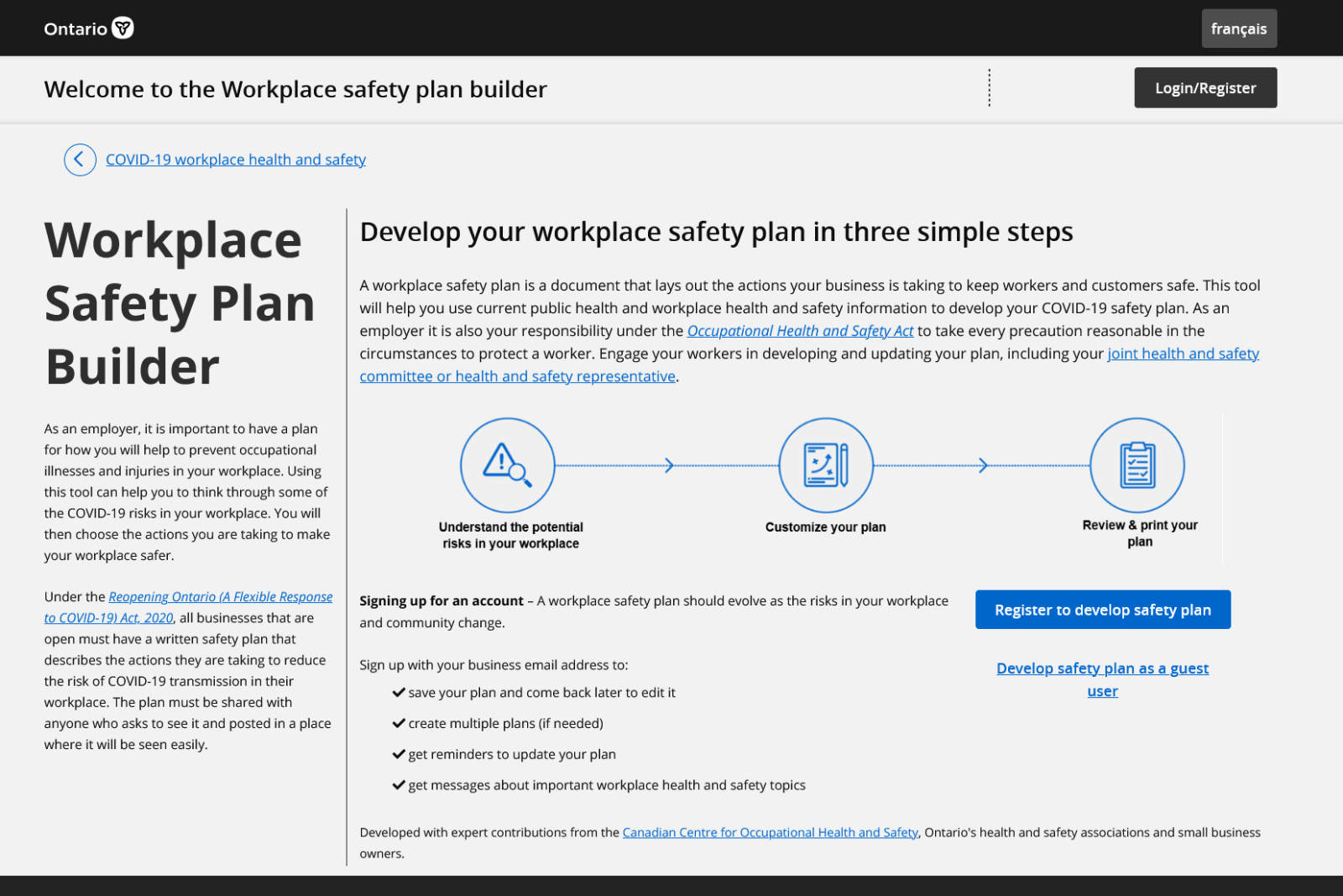 The workplace safety plan builder was developed with small business owners in mind and included small business owners in its design. With the input of users, the platform will continue to evolve to better meet the needs of business owners across Ontario.