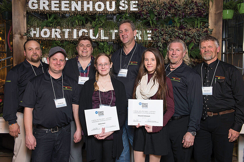 Golden Horseshoe Chapter board members attended the Horticultural Studies Award Ceremony at Niagara College on Apr. 6 and presented Melissa Amme from Welland (centre-left) and Cheyanna Vaillancourt from St. Catharines (middle-right) with bursaries on behalf of the chapter. Pictured with them (l-r) are board members Fiore Zenone, Tim Rivard, Scott Duff, Tim Cruickshanks, Chris DeCock and Chris Utter.