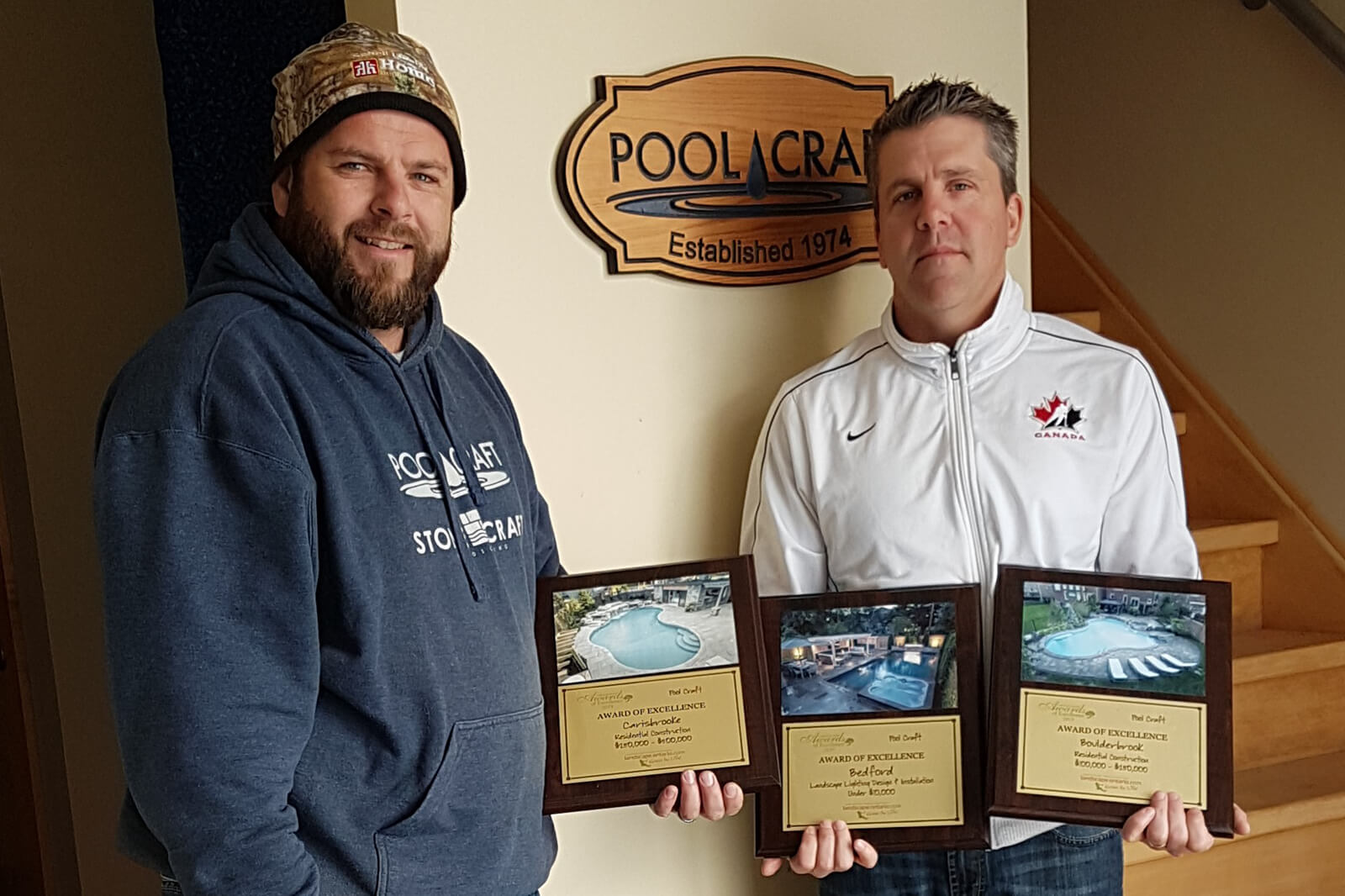 Last month, I had the opportunity to visit the offices of Pool Craft, owned by Jason Mitchell, and StoneCraft, owned by Curtis Hillier. Pool Craft recently won three Landscape Ontario Awards of Excellence and were unable to attend our big awards ceremony in January, so I thought it would be a nice gesture to hand deliver the awards plaques to them.