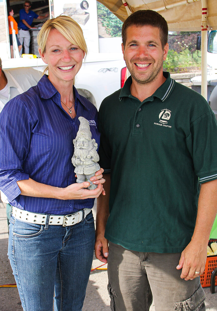 The 2013 Durham Supplier Showcase Barbecue was held at Sheridan Nurseries in Whitby in conjunction with the company’s 100th anniversary celebrations. The event featured dinner provided by the Chapter as well as product displays and give-aways from LO supplier members. Almost 100 people came out to participate in this event, that is unique to the Durham Chapter. April and Greg Scarlett of Urban Landscape Solutions were kept busy manning the food table, but took time out from their duties to pose with Grout, LO’s social media mascot.