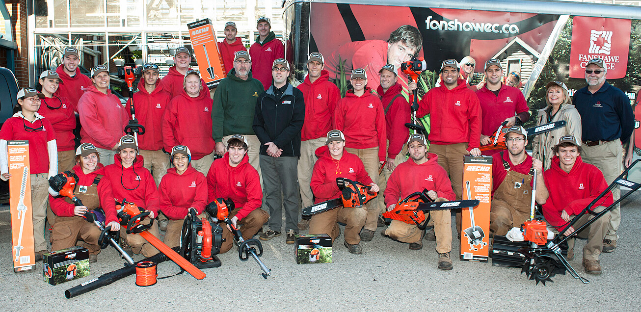 Decked out in their red outfits, students of the Fanshawe College’s horticulture program gathered to thank Echo Power Equipment for the use of many pieces of equipment. At the termination of the agreement, the school has the opportunity to purchase the equipment or return it to Echo. In photo, professor and academic program coordinator Michael Pascoe CLT offers thanks to Mike McConnell, representing Echo.