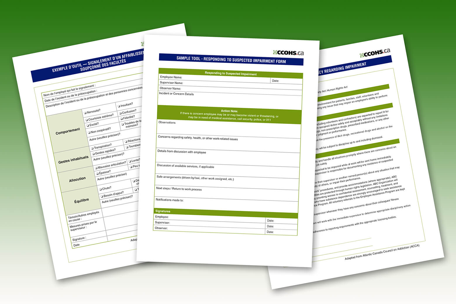 Courtesy of the Canadian Centre for Occupational Health and Safety (CCOHS), a sample policy and templates for are available to help employers deal with, and report suspected impairment in the workplace. Available for download in PDF format, all documents are provided in both English and French.