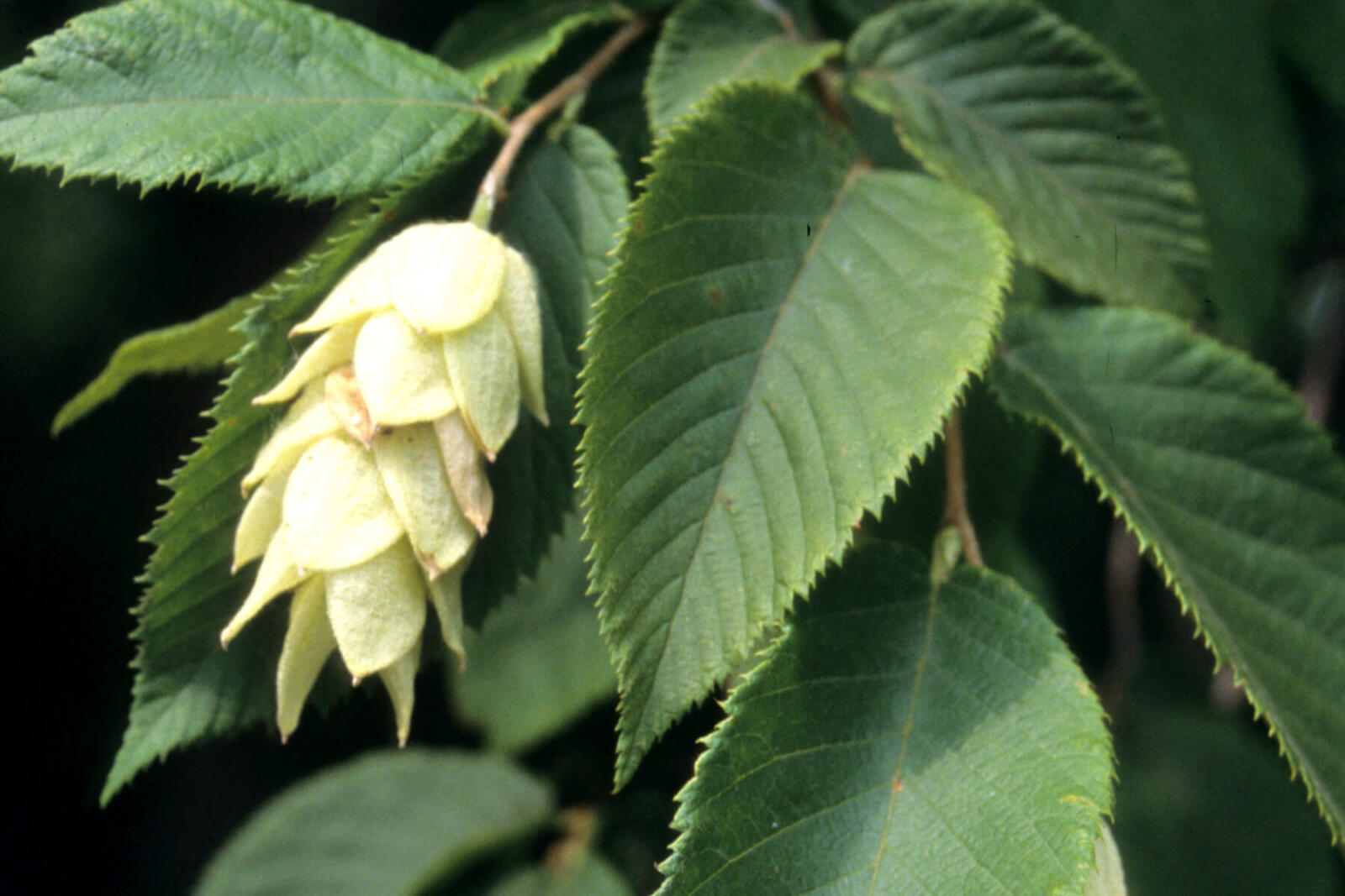 Some describe the clusters that appear at the end of the branches during autumn as looking like ostrich feet. On the same tree, this year’s fertilized female catkins produce the hop-shaped fruit that give the tree one of its other names: hop hornbeam, with its thin papery sacs that hang together in clusters of up to 20. The branches of simple, finely toothed leaves end with pendulous clusters of hops.