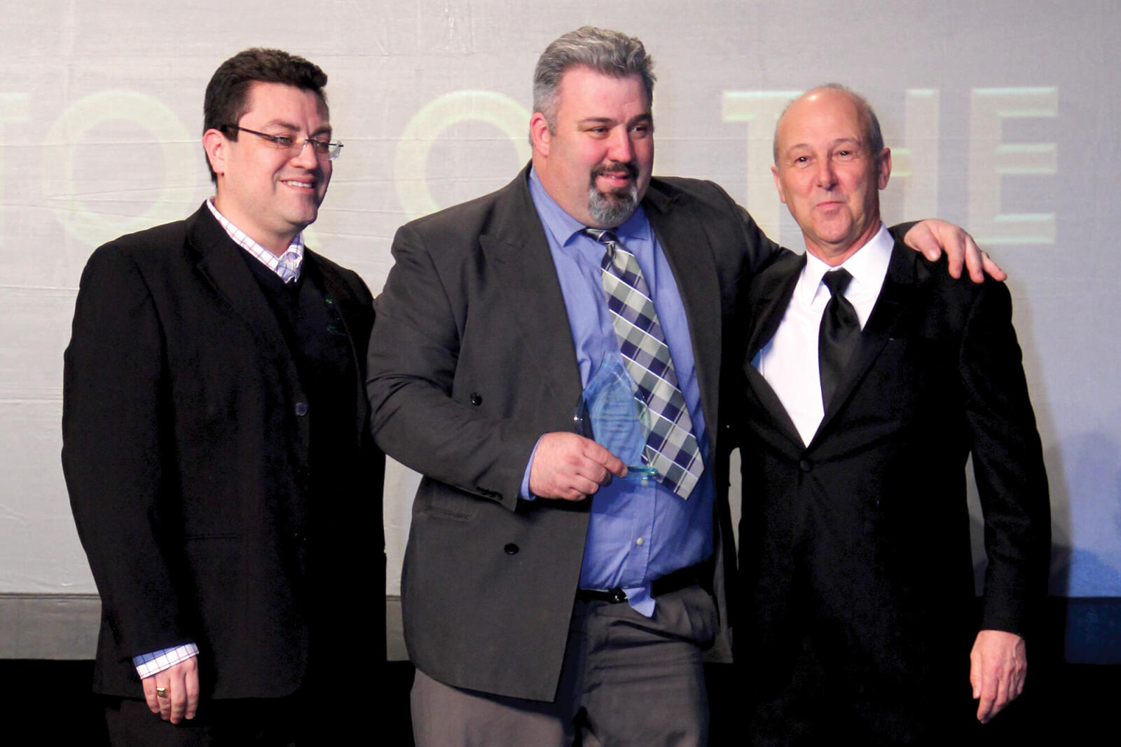 two men on a large video screen via SkypeThis year’s premier award recipient at the Awards of Excellence were blocked from attending the presentation after snow storms caused many highways to be closed. So, electronic communication took over, allowing The Landmark Group representatives Darren Bosch, left, and Jeff Scheper to appear live at the presentation of the Dunington-Grubb Award.