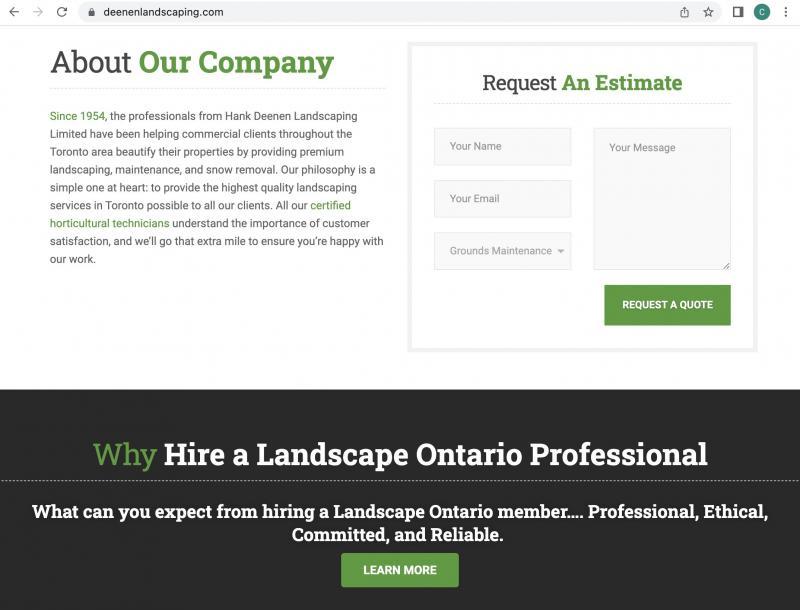Hank Deenen Landscaping Limited has been providing Award-Winning Landscape Construction, Grounds Maintenance and Snow Clearing for over 65 years! We are one of the few Landscape Industry Accredited Companies in Canada. We pride ourselves on well-trained, certified staff performing quality work at competitive rates.