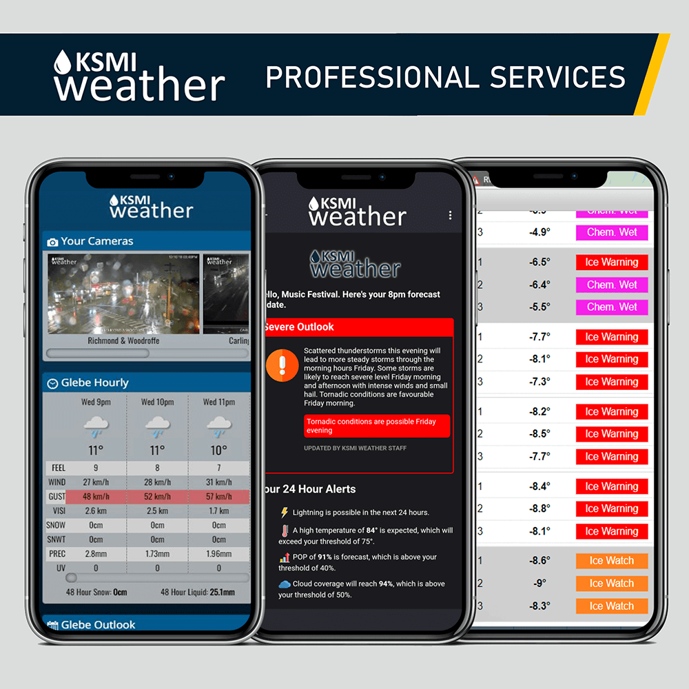 The KSMI client portal is your one-stop-shop for all weather data. Accessible on all devices, the portal contains: the latest forecast updates, interactive radar, mapping tools, weather alerts, live cameras, road surface conditions and more are always just a click away.