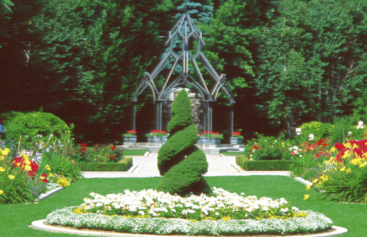 | Repetition of shape is an effective design tool. This spiral conifer at Casa Loma seems to echo the shape and structure in the distance. Exuberant borders retain an air of decorum thanks to clipped hedges, shaped conifers, manicured lawns and stone edging. |