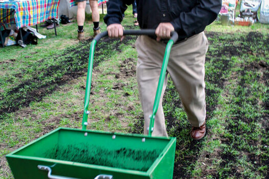 Participants aerated the lawn behind an office tower and spread the compost to improve the quality of the soil.