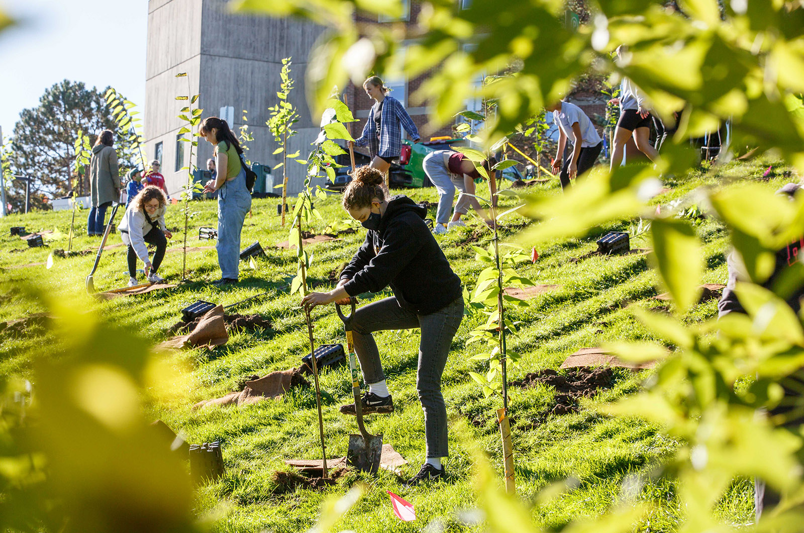 More than 200 volunteers participated in planting a variety of native tree species on a former toboggan hill on the school’s campus in Guelph, Ont. The trees will help transform the hill into a naturalized area to offset carbon emissions generated by the recent construction of Lang Plaza. Located outside of U of G’s MacDonald Hall, Lang Plaza opened in September, and features seating areas, a fire pit, bio-infiltration garden and a water fountain.